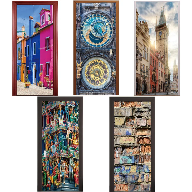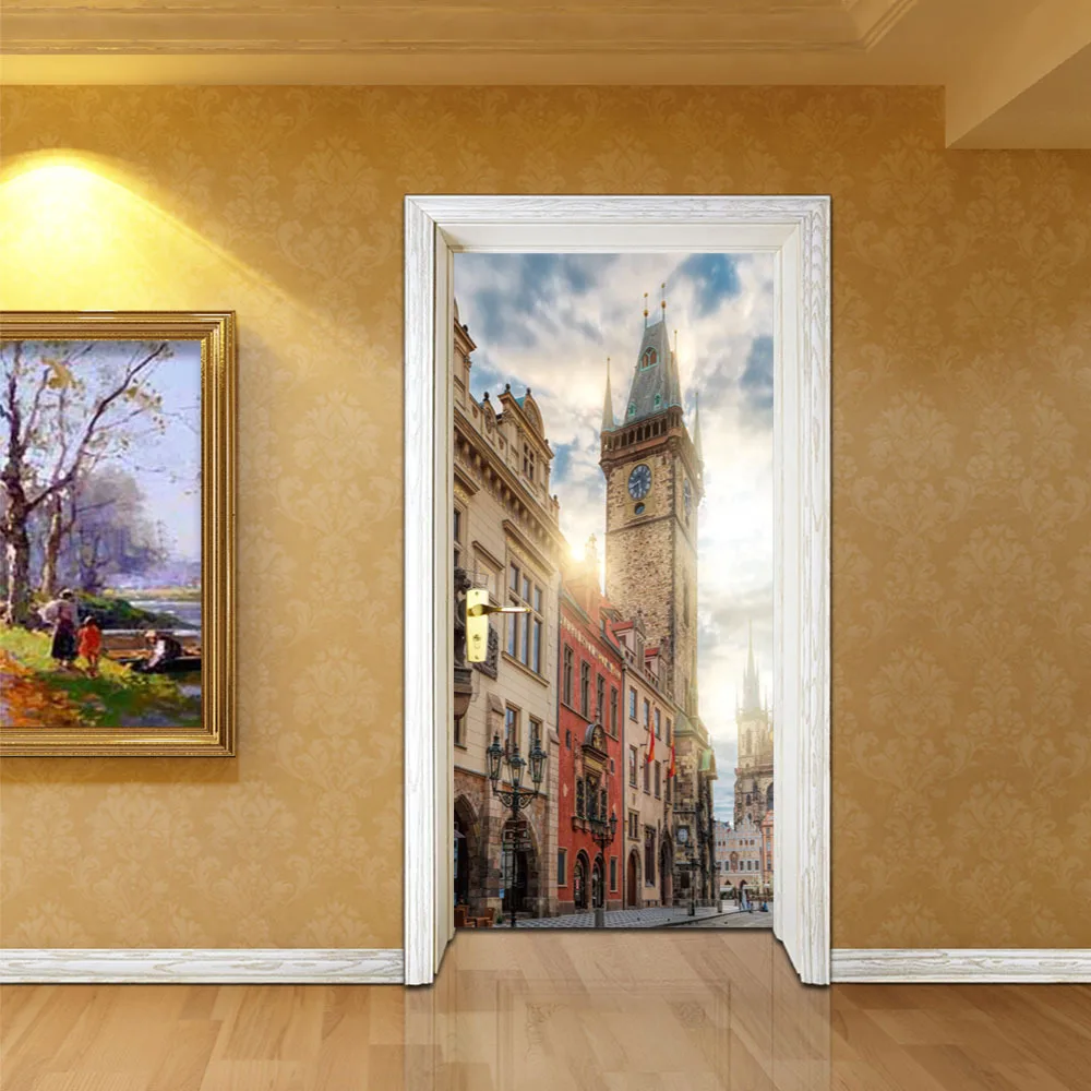 Dear definitely the 3D Door Sticker Temple Prague Square Clock Tower Venice Street Brick Wooden Door Renovation Home Decoration Paste Mural 77x200cm RECOMMENDED TODAY
