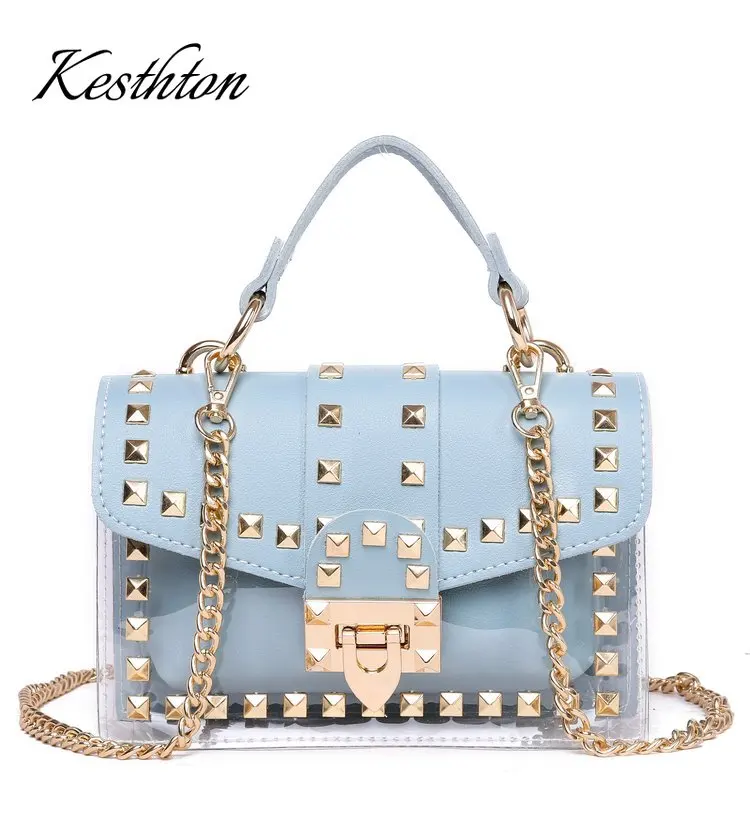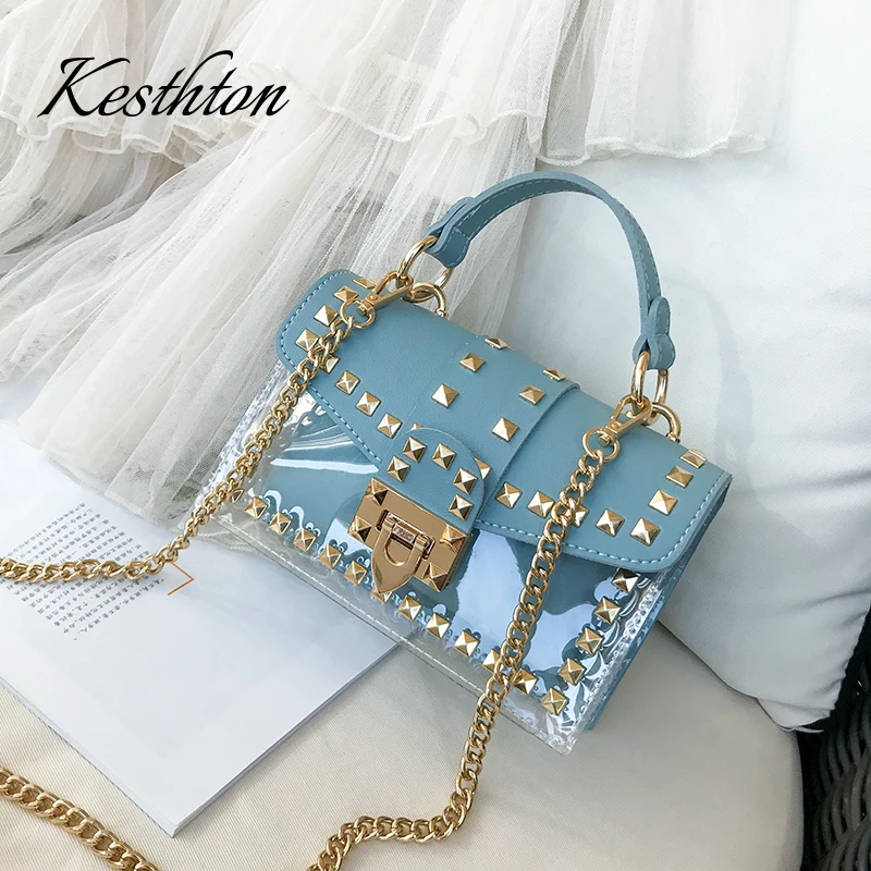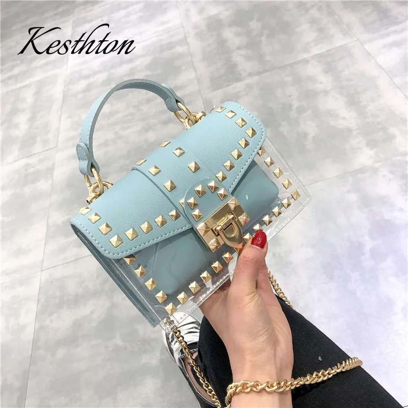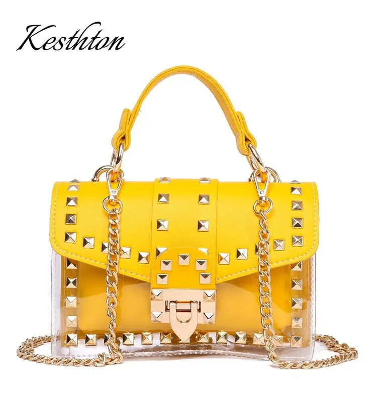 SPECIAL OFFERS 2019 New chains rivet women handbags small white black pink yellow blue pvc hasp handbags summer soft shoulder bags cross body one of the best
